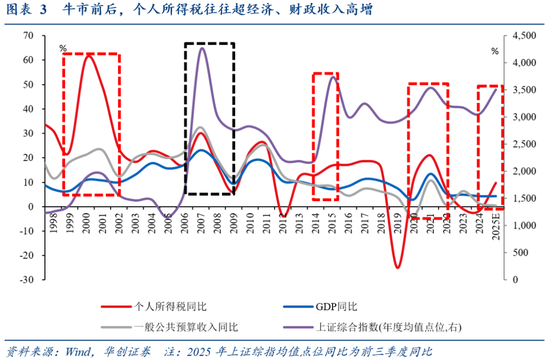 逻辑:根据历史经验,牛市前后,个税往往超经济、财政收入高增,主要是牛市对个税资本市场分项(股息红利所得+限售股转让所得+股权转让所得,合计占个人所得税20%)提振较大(2015年、2021年个税资本市场分项同比达约20%)。