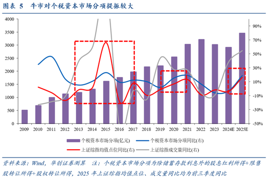 测算:分两步测算可得,今年个人资本市场相关税收增长或约400亿:第一步,基于2023年个税资本市场分项占比测算2024年个税资本市场分项,约2900亿;第二步,基于2024年个税资本市场分项测算值,按官方数据测算2025年个税资本市场分项,约3300亿(同比增加约400亿)。