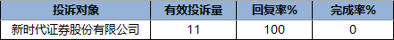 从证券公司处理情况来看,新时代证券面对投诉回复率达100%。