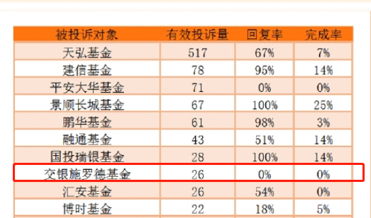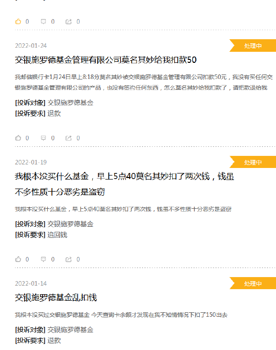 根据黑猫投诉【投诉入口】【投诉入口 后台统计数据,2021年1月1日至2022年2月28日,黑猫投诉收到交银施罗德基金投诉26起,没有回复。其中被投诉原因是乱扣款。