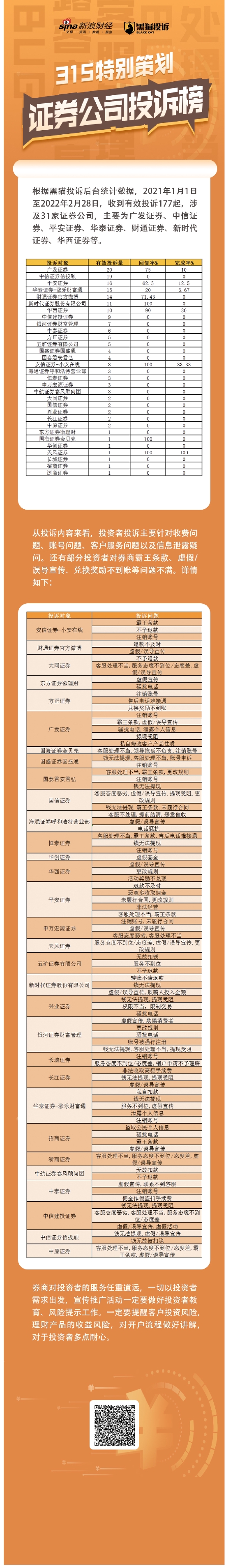 3月15日,根据黑猫投诉【投诉入口】后台统计数据,2021年1月1日至2022年2月28日,收到有效投诉177起,涉及31家证券公司,主要为广发证券、中信证券、平安证券、华泰证券、财通证券、新时代证券、华西证券等。投诉问题主要涉及收费问题、账号问题、客户服务问题以及信息泄露疑问。还有部分投资者对券商霸王条款、虚假/误导宣传、兑换奖励不到账等问题不满。