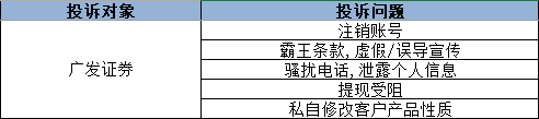 根据黑猫投诉【投诉入口】后台统计数据,2021年1月1日至2022年2月28日,广发证券收到有效投诉20起投诉。被投诉的主要问题涉及注销账号、霸王条款、虚假/误导宣传、骚扰电话、提现受阻等。