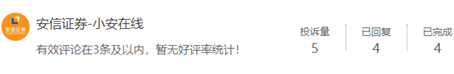 对于投资者的投诉,安信证券积极回复,3起已全部解决。由此可见安信证券对待用户投诉反应及时,态度良好。