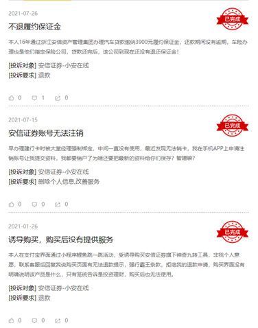 根据黑猫投诉【投诉入口】后台统计数据源,2021年1月1日至2022年2月28日,安信证券-小安在线收到3起投诉,投诉内容诱导购买、账号无法注销等,详情如下: