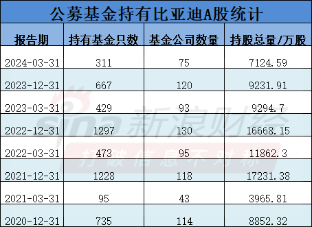 按照持股数量看,根据年报数据,2021年12月,公募基金合计持有1.7231亿股比亚迪A股,到2022年底持有1.6668亿股,到2023年底持有9232万股,两年间减持了7999万股,按照6月25日比亚迪收盘价254元测算,减持的8000万股市值超200亿元。按照一季报重仓股数据,2022Q1公募基金合计持有1.1862亿股比亚迪股票,到2023Q1公募持有9294.7万股比亚迪股票,到2024Q1持有7124.6万股,也就是说两年间减持了4737.7万股,市值约120亿元。