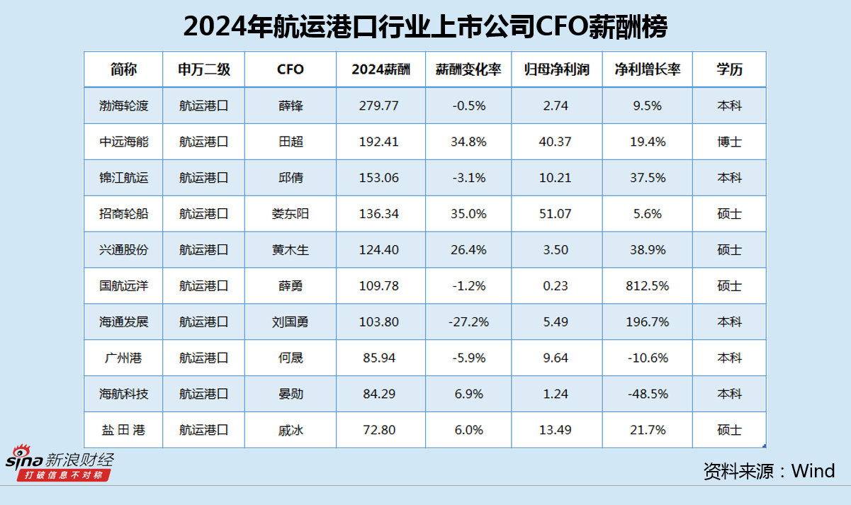 行业内,渤海轮渡CFO薛锋小幅降薪至279.77万元,位列业内之首,也是唯一日薪超万元的CFO。
