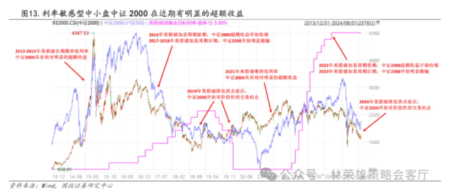 对应到A股市场,受到全球“高切低”风格映射影响,近期利率敏感型中小盘中证2000指数出现阶段性超额,同时,处于高位的品种(红利板块等)纷纷出现回调。事实上,当我们复盘后发现:在美联储正式降息附近利率敏感性中小盘均有超额表现,映射到A股市场在2019年降息过程中也可以获得验证。这种交易性机会的持续性取决于是否形成持续降息预期,若9月美联储正式降息后形成持续降息预期,利率正式进入到下降通道,那么这种利率敏感型中小盘的占优将会持续。若9月美联储正式降息后不再做连续持续降息操作,那么这种占优过程将会终止。对于A股而言,需要提示的是:面向即将到来的中报业绩正式披露期,市场近期阶段性关注基于高切低的利率敏感型超跌中小盘一定要具备业绩支撑,否则将面临挑战。中期层面,我们并未修正对于“重返大盘股”的预判。
