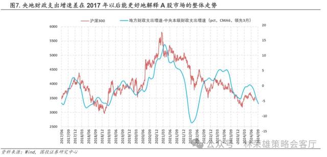 第三,大盘指数层面,对于近期市场高度关注M1数据创历史新低。在2014年以前A股市场的整体涨跌节奏基本和M1同比增速的节奏一致,这一规律被称为“M1定买卖”。但在2014年之后两者相关性有所下降,在近3年定价有效性则明显下降,症结在于M1同比增速本质上和地产周期是高度绑定的金融现象,而经济转型背景下货币投放——地产销售——通货膨胀的传导金融路径走不通了。在此,我们更为深刻的观察是:在过去几年,对于A股宏观策略的定价核心可能正在逐渐从金融视角转移向财政视角,当前定调“财政是国家治理的基础和重要支柱”,根据我们此前的研究结论:央地支出增速差(地方-中央支出增速的差值)或许是解释沪深300定价更有效的前瞻指标(领先1-2个月),该数值扩张,则有利于大盘指数,反之亦然,其背后暗含的是地方化债进程与中央转移支付力度的观察,该指标从2017年至今对大盘指数有较强的相关性。而从7月下旬公布最新的6月财政数据来看,地方财政支出强度有进一步下降的趋势,央地财政支出增速差6期中心移动平均值从5月的-4.24pct扩大至-5.92pct。
