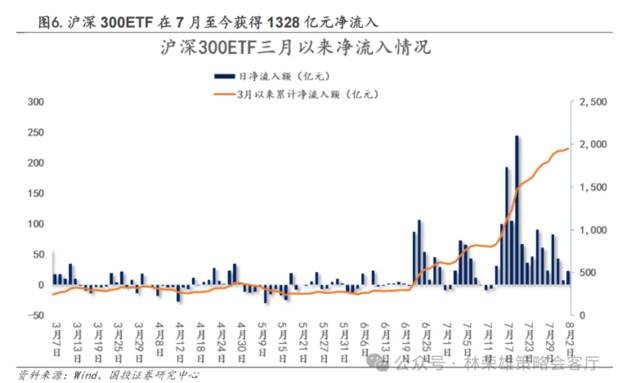 ETF资金本周再度大幅流入沪深300,流向小盘风格的中证500和中证1000的趋势仍在持续。市场近期的增量资金主要来源于ETF层面的流入。从沪深300ETF净流入规模来看,6月份共计净流入341.5亿元,而7月以来沪深300ETF再度获得1328.2亿元净流入,上周净流入300亿元,本周进一步净流入178亿元。这是3月份以来首次出现ETF集中流入的现象,对于稳定A股市场和投资者情绪有重要的正向作用。