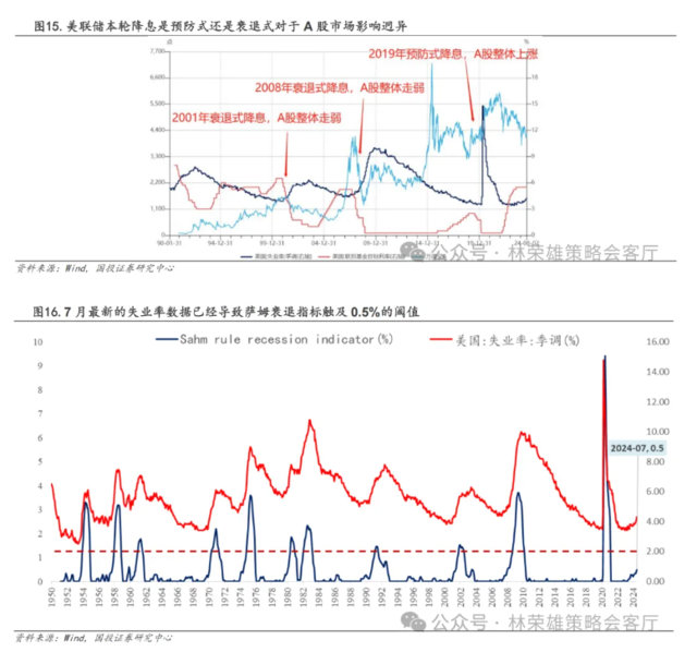 展望后市,本轮全球大类资产波动的后续影响主要有两个,第一是在分子端的尾部风险,也就是美国可能即将到来的衰退,美联储的降息有一定的可能,不再是类似2019年的预防式降息,而是类似2008年和2001年的衰退式降息,前者引发的是宽松交易+复苏交易,表现为全球资金从美国市场外溢,A股受益上涨;后者引发的是衰退交易+避险交易,表现为全球风险资产共振下行,美债、黄金等避险资产占优。而衰退和降息何者先到来?目前还需要等待8月美国的经济数据进一步确认,但是基于美国失业率计算的萨姆衰退指标(Sahm rule recession indicator),这一指标由前美联储经济学家Claudia Sahm提出,用以预测经济衰退。该法则指出,当美国失业率的3个月移动平均值相对于过去12个月的最低点上升超过0.5个百分点时,经济衰退就可能开始。这一规则自1970年代以来的准确率为100%。在7月失业率数据公布后已经触及0.5%的阈值,这意味着当前美国可能已经进入衰退状态中,1950年至今,萨姆衰退指标发出的11次信号中,只有1960年的衰退发生在5个月后,其余10次信号出现的时候美国已经处于衰退当中。