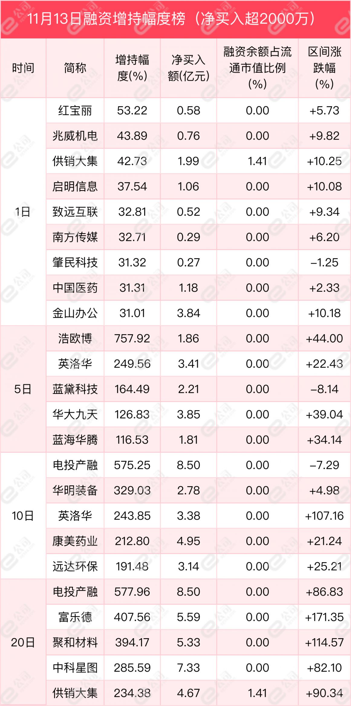 从增减持幅度来看,单日净买卖超2000万元以上的个股中,红宝丽、兆威机电、供销大集获融资增持幅度居前,分别为53.22%、43.89%、42.73%。