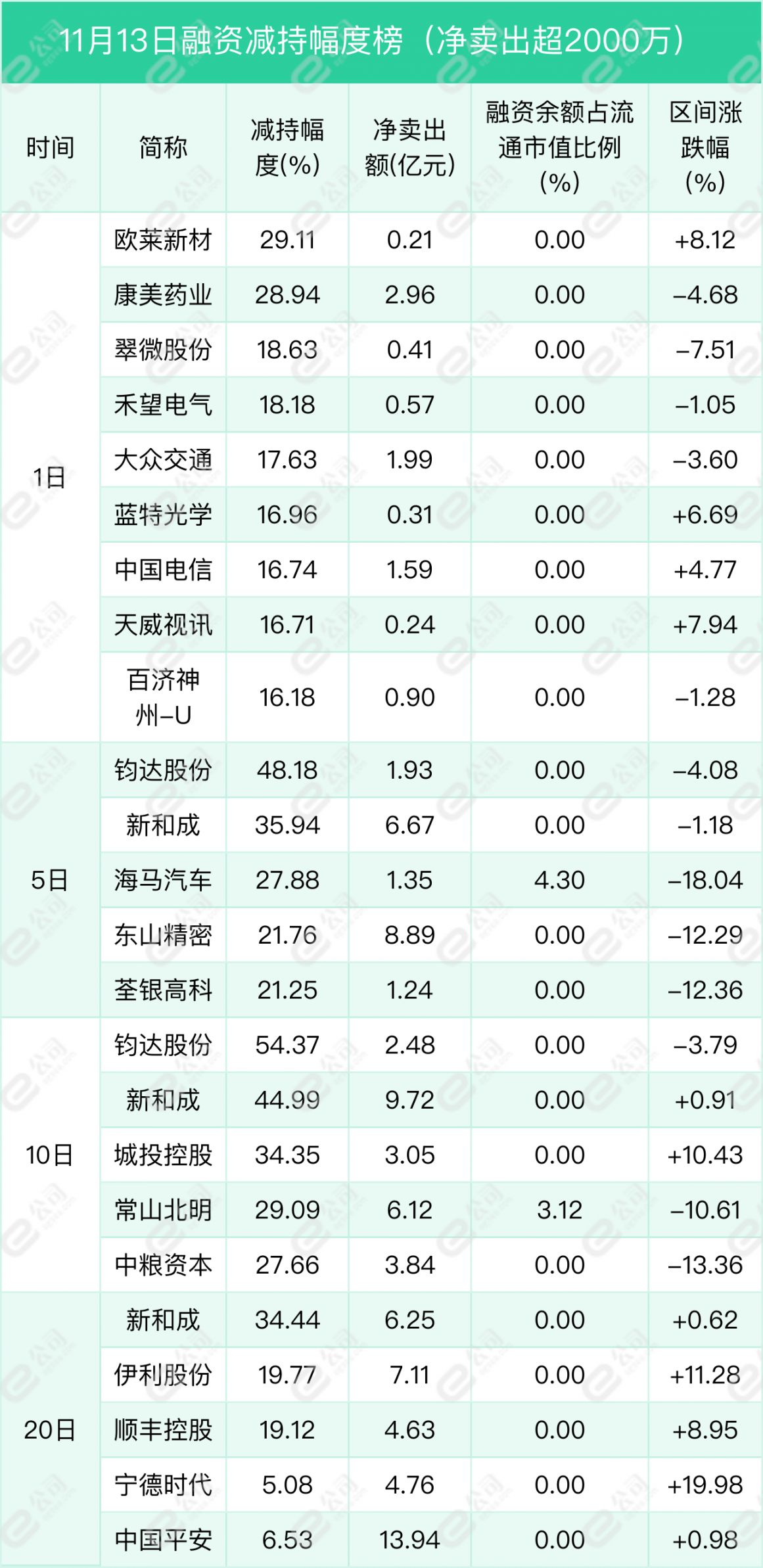 欧菲光、康美药业、长江电力遭融资净卖出金额居前,分别为3.59亿元、2.96亿元、2.34亿元,减持幅度分别为10.84%、28.94%、2.63%。