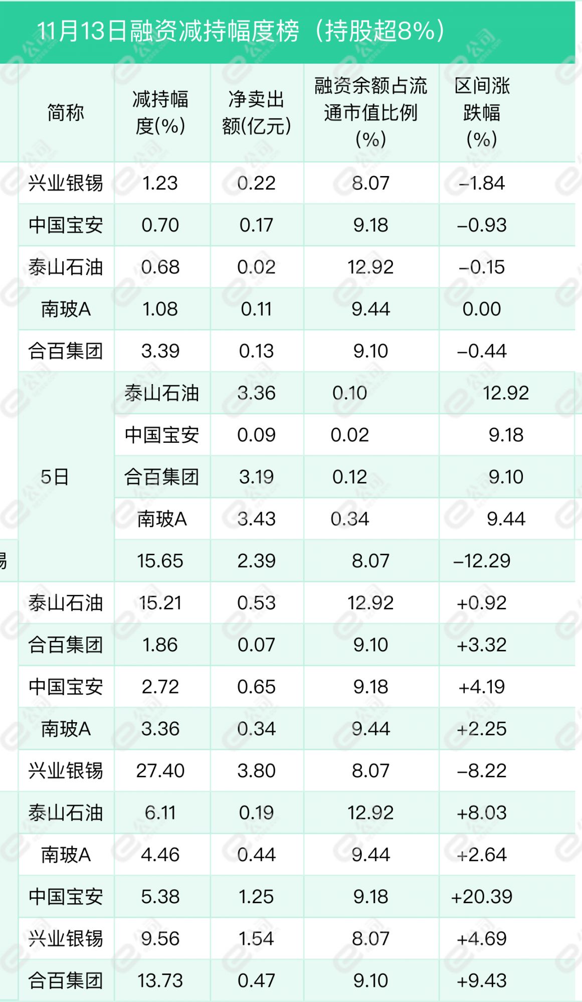 兴业银锡、中国宝安、泰山石油遭融资减持幅度居前,分别为1.23%、0.7%、0.68%。