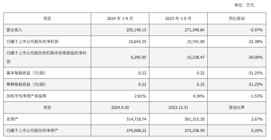 根据最新财报,2024年1-9月,齐峰新材实现营收25.5亿元,同比减少5.97%;净利润1.06亿元,同比减少32.38%。公司表示,2024年1-9月业绩同比下滑主要原因是产品售价调整导致单位毛利降低。
