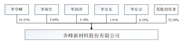 李学峰及一致行动人李安宗、李安东、李润生、李润泽直接和间接合计持有齐峰新材股份的比例为27.41%。