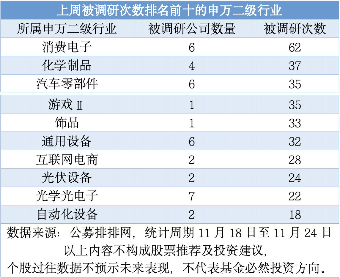 从申万二级行业被调研次数来看,消费电子最受关注,该行业上周有6家上市公司被公募机构调研62次,居首。此外,化学制品、汽车零部件、游戏Ⅱ、饰品和通用设备被调研次数差距不大,均被调研30次至40次之间。上周被调研次数排名前十的行业均被调研不少于18次。