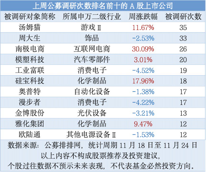汤姆猫被调研35次居首,当周股价涨幅达11.67%。此外,周大生、南极电商、模塑科技(维权)、工业富联、硅宝科技、奥普特、漫步者、金博股份、欧陆通、雅化集团等被调研次数居前,均被调研不少于12次。被调研次数排名前十的11家公司中(含并列),5家公司上周股价上涨,其中南极电商涨幅最大,累计涨幅超30%。