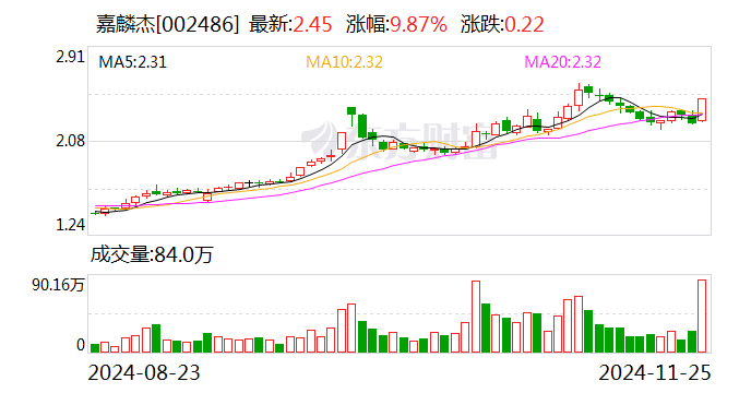 嘉麟杰(SZ002486,收盘价:2.45元)11月25日晚间发布公告称,上海嘉麟杰纺织品股份有限公司全资子公司上海嘉麟杰纺织科技有限公司、全资孙公司上海嘉麟杰服饰有限公司近期收到与收益相关的各类政府补助资金共计约172万元,占公司最近一期经审计的归属于上市公司股东净利润的3.35%。