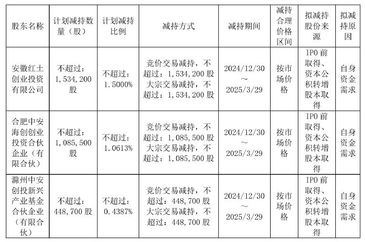 12月6日晚间,龙迅股份(688486)发布公告称,公司股东红土创投、合肥中安、滁州中安因自身资金需求拟合计减持不超过3%公司股份,减持期间为2024年12月30日至