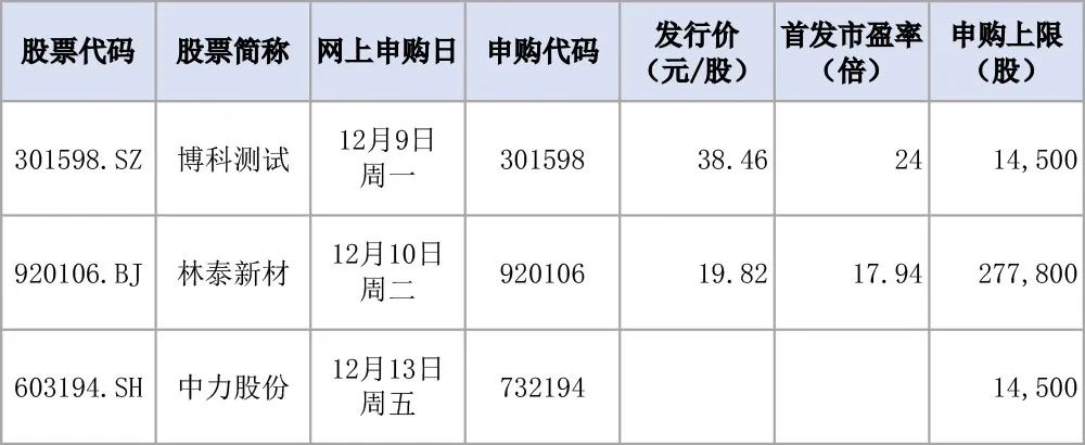据目前安排,若无变化,下周(12月9日至13日)有3只新股可申购,包括创业板1只、沪市主板1只和北交所1只。