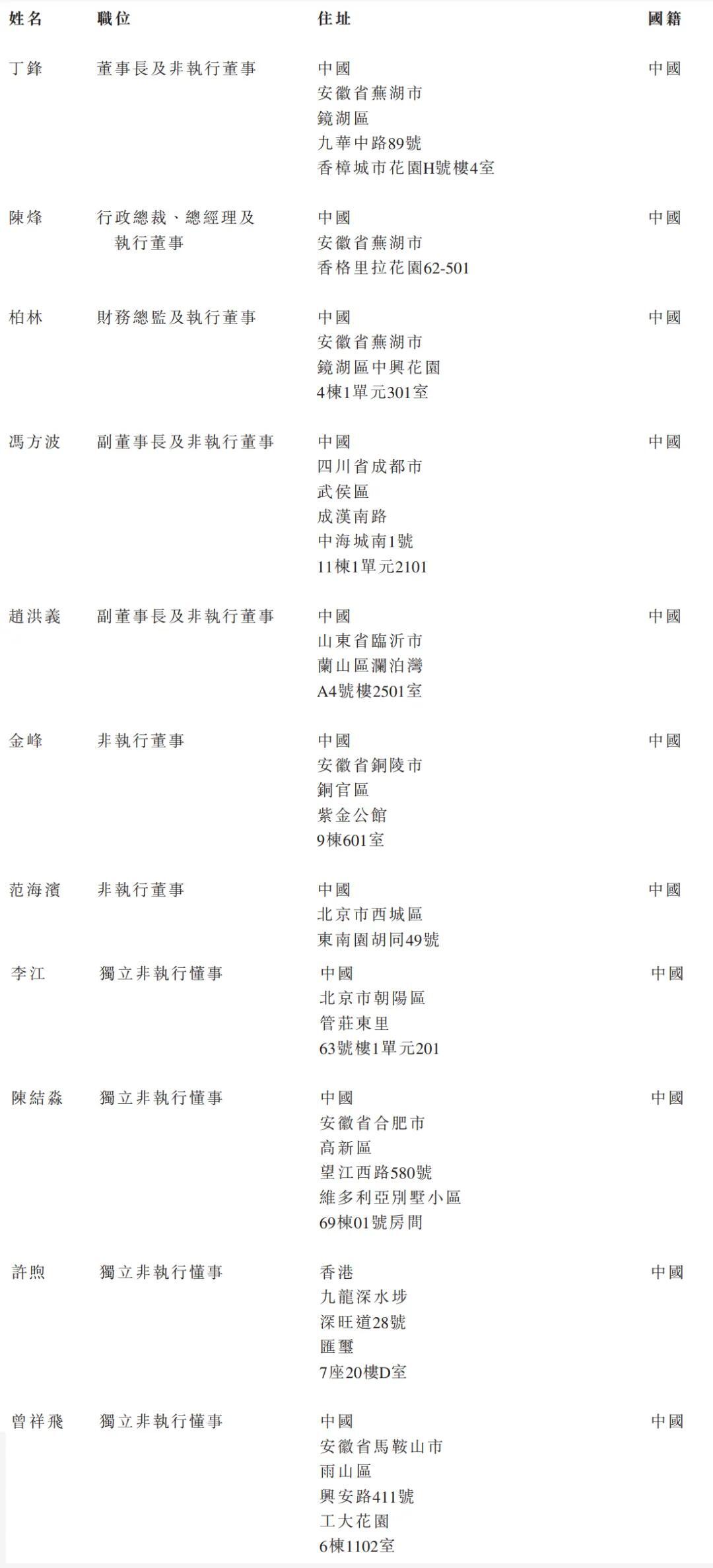 海螺材料董事长、非执行董事为丁锋,行政总裁、总经理及执行董事为陈烽,财务总监及执行董事为柏林,副董事长及非执行董事为冯方波,副董事长及非执行董事为赵洪义,非执行董事分别为金峰、范海滨、独立非执行董事分别为李江、陈结淼、许煦、曾祥飞。
