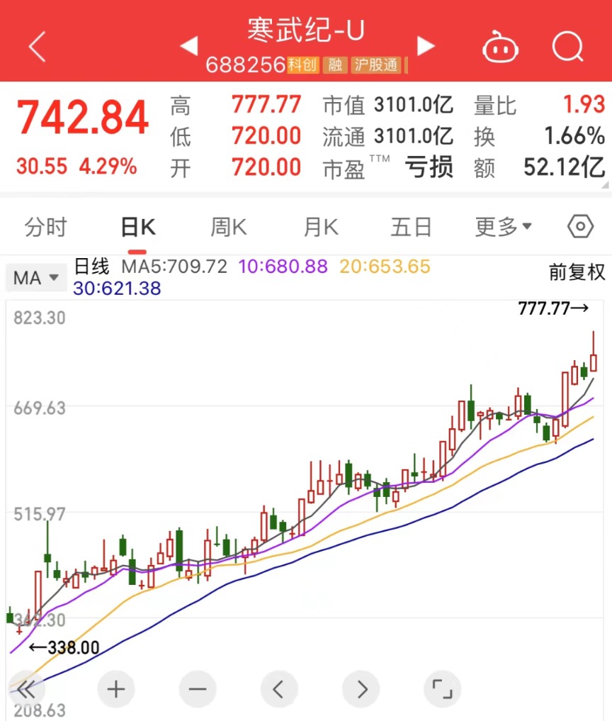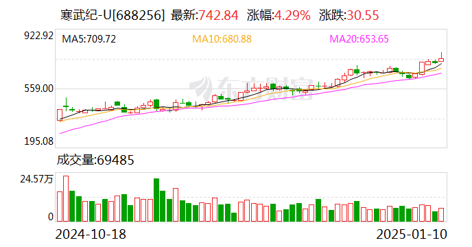 2024年,寒武纪累计涨超387%,剔除新股后,成为A股年度涨幅王。2025年开年,寒武纪涨势不减,1月7日涨超10%,创历史新高。今天上午,寒武纪上涨4.29%,盘中最大涨超9%,股价一度冲至777.77元,刷新历史新高,最新市值为3101亿元,上午收盘价为742.84元/股,仅次于贵州茅台,为A股第二高。
