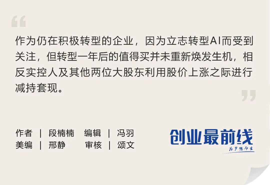 作为仍在积极转型的企业,因为立志转型AI而受到关注,但转型一年后的值得买并未重新焕发生机,相反实控人及其他两位大股东利用股价上涨之际进行减持套现。