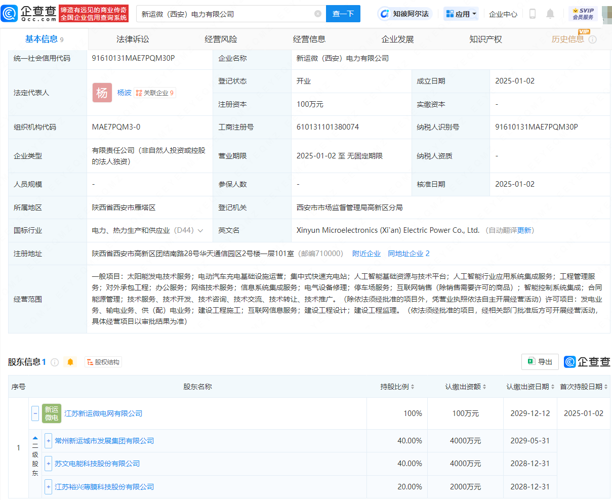 企查查APP显示,近日,新运微(西安)电力有限公司成立,法定代表人为杨波,注册资本为100万元,经营范围包含:集中式快速充电站;人工智能基础资源与技术平台;人工智能行业应用系统集成服务;工程管理服务;对外承包工程;办公服务等。企查查股权穿透显示,该公司由江苏新运微电网有限公司全资持股,后者由苏文电能(300982)、裕兴股份(300305)等共同持股。