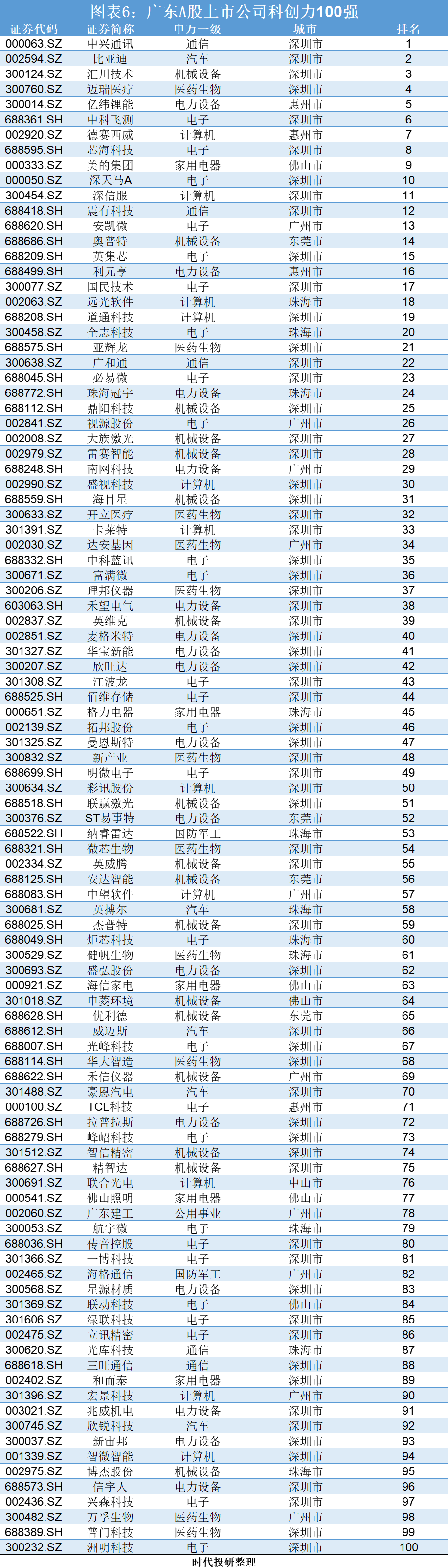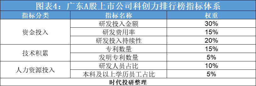 为更好地衡量企业的科创力,时代投研从企业的资金投入、技术积累、人才资源投入三大维度出发,对研发费用等7个细分指标给予不同的权重进行打分排名,制作了广东A股上市公司科创力百强排行榜。