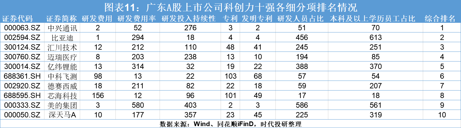 跟中兴通讯相似,比亚迪在研发费用、专利数量、发明专利数量3个细分指标的表现均较为亮眼。而在研发费用率、研发人员占比、本科及以上学历员工占比方面,比亚迪的表现均不及中兴通讯,不过,在研发投入持续性方面,比亚迪在广东A股上市公司中排名第18位,在科创力前十企业则位列第一。