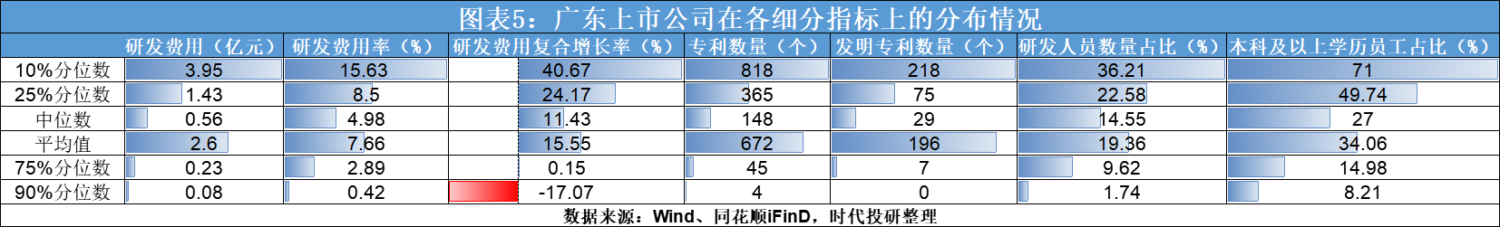 3.广东A股上市公司研发投入分布不均。在研发费用、专利数量和发明专利数量方面,广东A股上市公司出现平均值远超25%分位数的现象,表明广东上市公司在这三大指标上存在分布不均的问题。