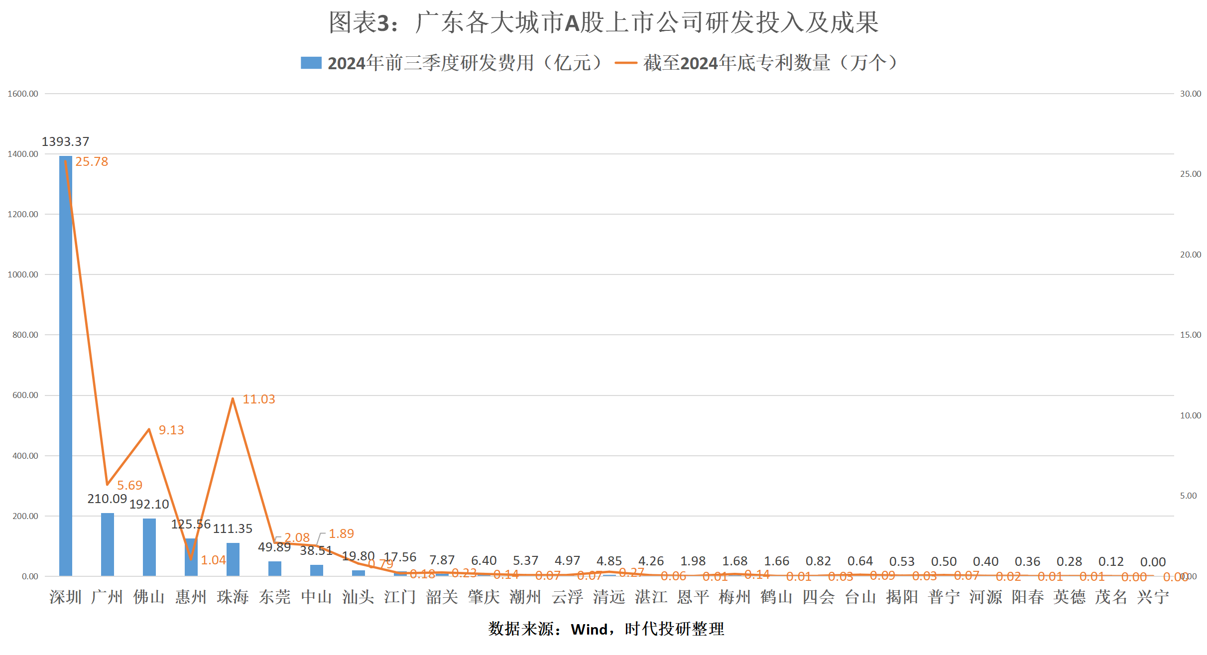 相比之下,广州、佛山两市上市公司的研发费用虽然位列第二、第三位,但是远低于深圳,2024年前三季度分别为210.09亿元、192.10亿元,占比分别为9.55%、8.73%。
