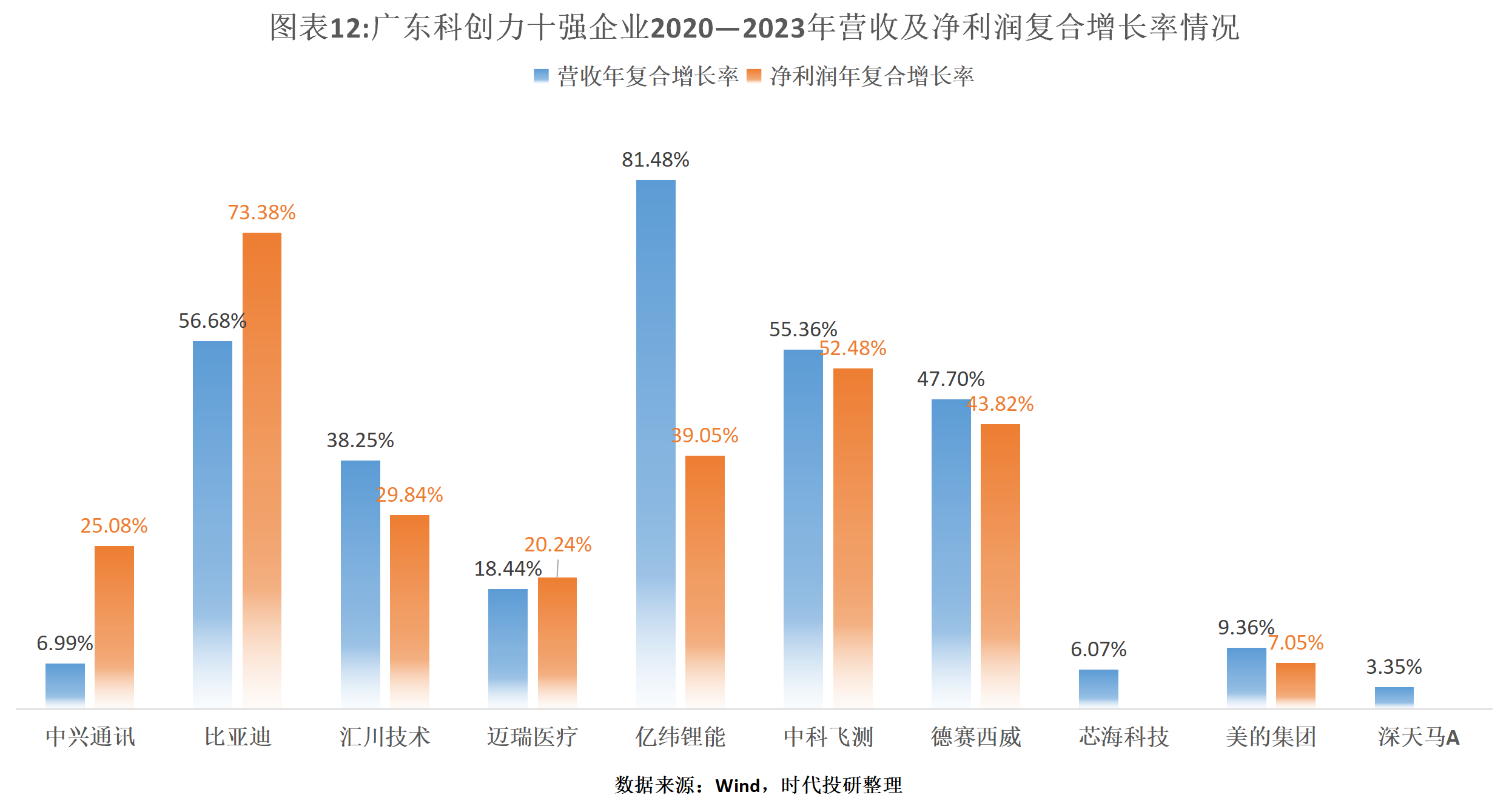 从业绩表现来看,除了芯海科技和深天马A,其他8家企业2020—2023年的营收、净利润均呈现增长态势。其中,亿纬锂能的营收年复合增长率在十大企业中排名第一,达到81.48%;而净利润方面则由比亚迪领跑,年复合增长率达到73.38%。