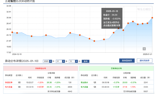 2025年1月13日,三花智控盘中股价来了个快速回调,短短5分钟内跌幅就超过了2%。截至当日9点30分,股价报26.6元,成交额为3.71亿元,换手率为0.37%。