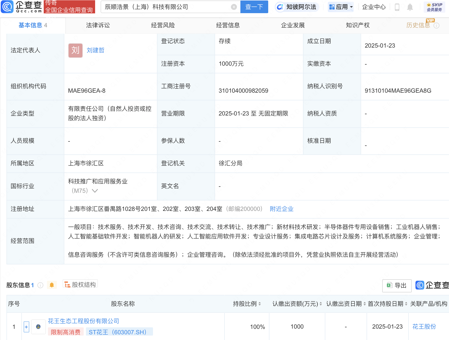 企查查APP显示,近日,辰顺浩景(上海)科技有限公司成立,法定代表人为刘建哲,注册资本1000万元,经营范围包含:半导体器件专用设备销售;人工智能基础软件开发;智能机器人的研发;人工智能应用软件开发;集成电路芯片设计及服务等。企查查股权穿透显示,该公司由ST花王(维权)(603007)全资持股。