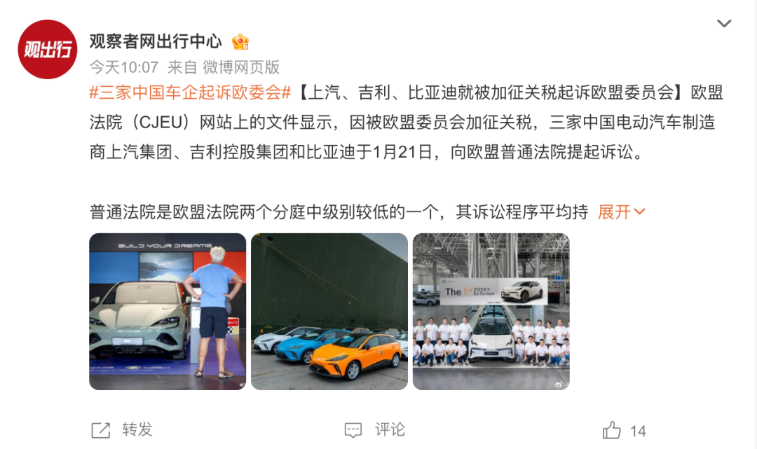 对于欧委会的反补贴行为,众多车企也纷纷站出来,以实际行动表达对欧盟不合理裁决的不满与抗争决心。作为中国电动汽车产业的领军企业,上汽、吉利、比亚迪等车企在欧洲市场已经取得显著的成绩。为了维护自身合法权益,上汽、吉利、比亚迪等车企毅然决定向欧盟普通法院提起诉讼,但欧盟法院暂未披露具体细则。这些车企的联合抗争,不仅代表了自身的利益诉求,更展现了中国电动汽车企业在面对贸易保护主义时的坚定立场和团结精神,为中国电动汽车产业在国际市场上争取公平待遇注入了强大动力。