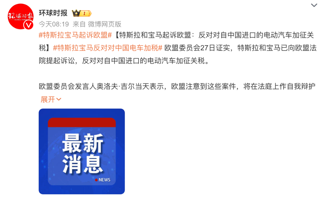 据媒体报道,欧盟委员会27日证实,特斯拉和宝马已向欧盟法院提起诉讼,反对对自中国进口的电动汽车加征关税。此前,三家中国汽车制造商上汽集团、吉利控股集团和比亚迪也向欧盟普通法院提起诉讼,反对欧盟委员会加征关税的行为。