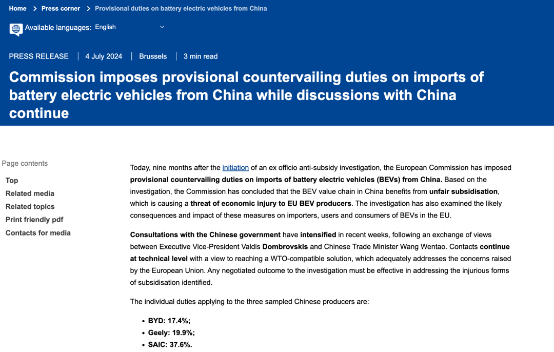 2024年7月,欧盟进一步加大调查力度,宣布对中国电动汽车加征临时关税,这一举措使得许多原本计划在欧洲市场推出新车型的企业,不得不重新评估市场策略,一些已经签订的订单也因为关税的增加面临履约困境。