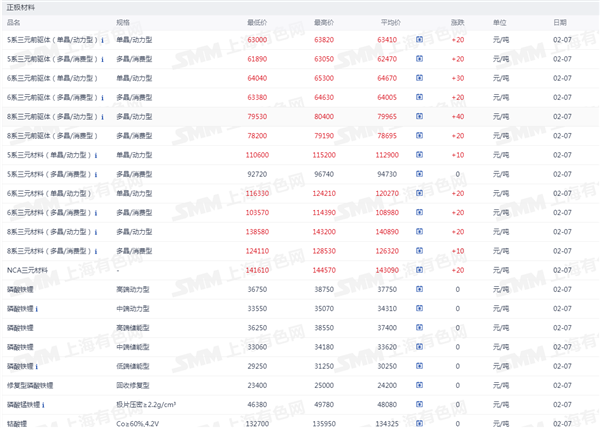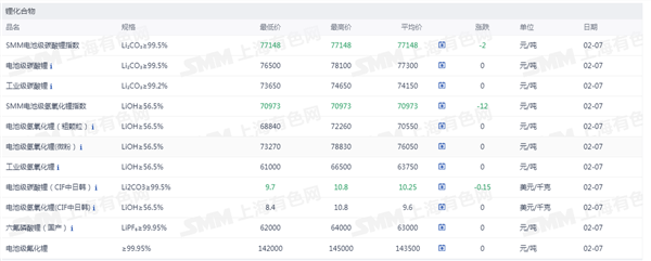 据上海有色网,截止2月7日,电池级碳酸锂7.65-7.81万元/吨,均价7.73万元/吨,与上一工作日持平;工业级碳酸锂7.365-7.465万元/吨,均价7.415万元/吨,与上一工作日持平。