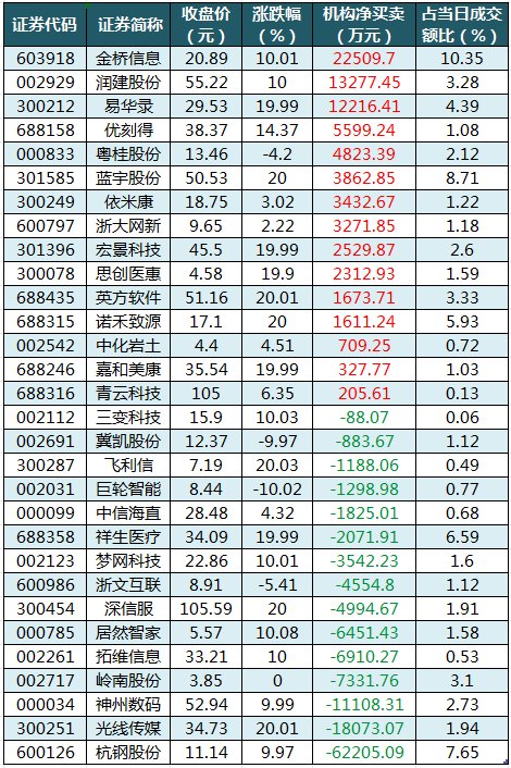 龙虎榜机构净买入15股金桥信息居首盘后龙虎榜数据显示,今日机构席位资金合计净卖出约5.42亿元。其中,净买入的个股15只,净卖出的个股15只。机构净买入最多的股票是金桥信息,净买入金额约2.25亿元;机构净买入居前的还有润建股份、易华录、优刻得、粤桂股份、蓝宇股份等。机构净卖出最多的股票是杭钢股份,净卖出金额约6.22亿元;机构净卖出居前的还有光线传媒、神州数码、岭南股份等。