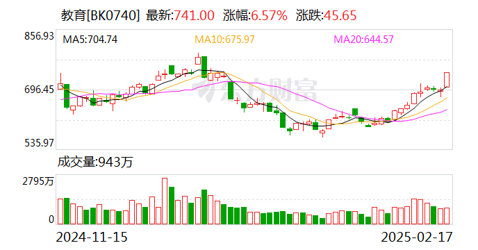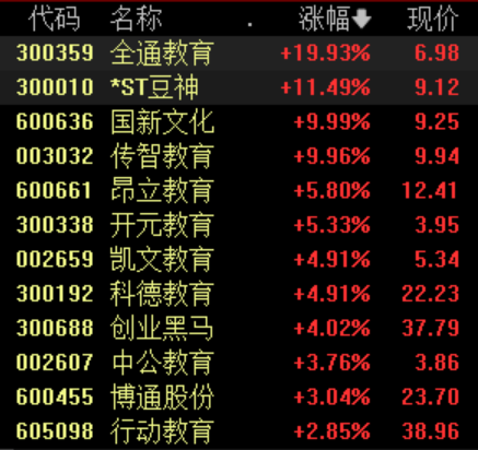 2月17日,教育板块强势领涨,截至发稿,全通教育20%涨停,*ST豆神涨超11%,国新文化、传智教育(维权)涨停,昂立教育、开元教育、凯文教育等跟涨。