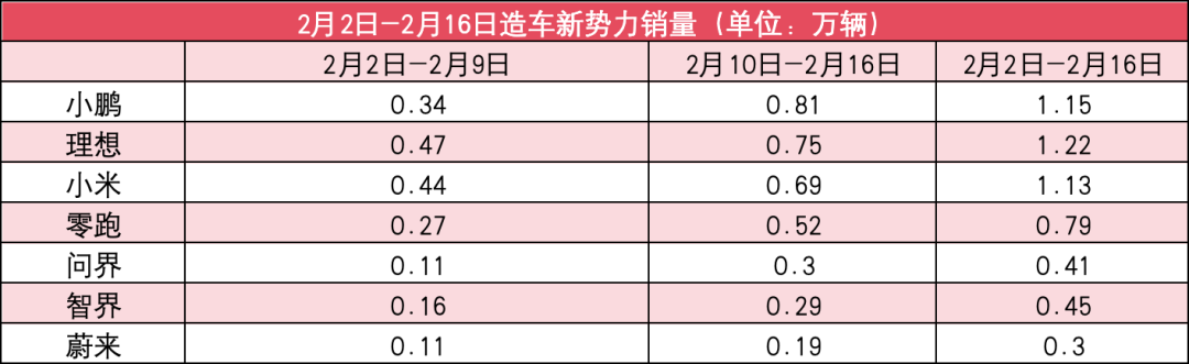 首先来看夺得第一的小鹏。2月10日—2月16日,小鹏销量为0.81万辆,较前一周增长了0.47万辆;2月3日—2月16日累计销量为1.15万辆。理想则以0.06万辆之差,排在了小鹏之后。2月10日—2月16日,理想销量为0.75万辆,较前一周增长了0.28万辆;2月3日—2月16日,理想累计销量为1.22万辆。