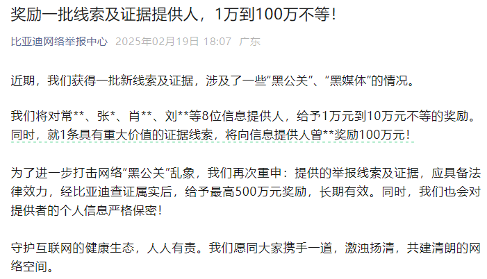 为了进一步打击网络“黑公关”乱象,比亚迪再次表示,提供的举报线索及证据,应具备法律效力,经比亚迪查证属实后,给予最高500万元奖励,长期有效。同时,比亚迪也会对提供者的个人信息严格保密。