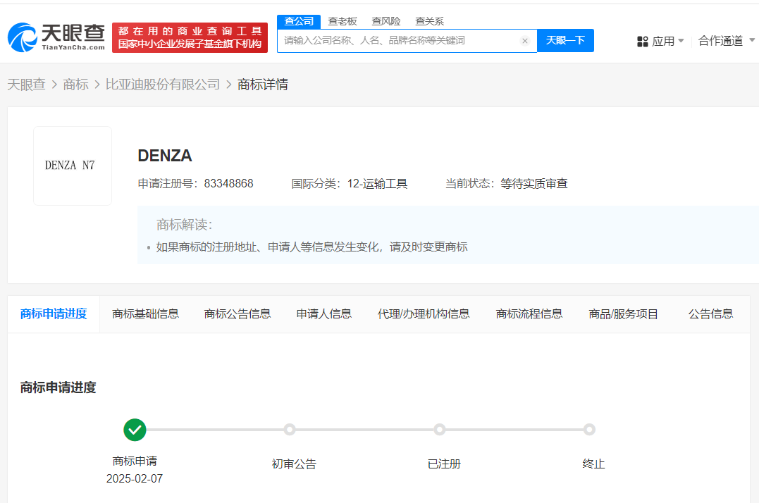 天眼查知识产权信息显示,近日,比亚迪(002594)申请注册“DENZA N7”商标,国际分类为运输工具,当前商标状态为等待实质审查。