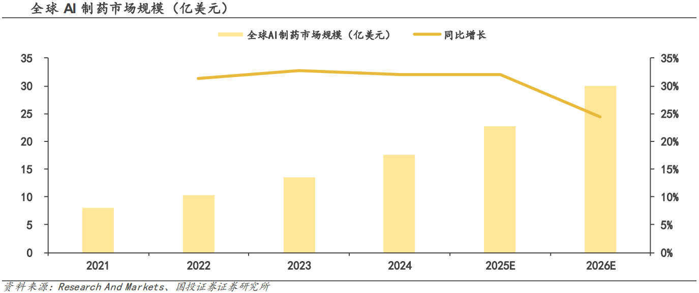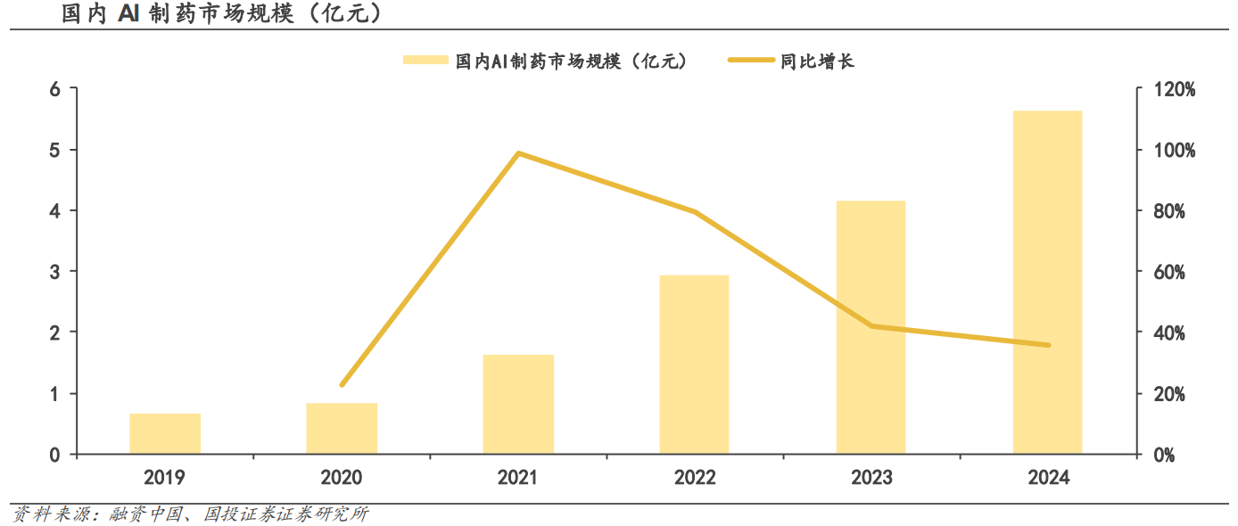 全球AI制药市场规模从2021年的7.92亿美元提升至2024年的17.58亿美元,CAGR约为30.45%,预计2026年其市场规模将提升至29.94亿美元。国内AI制药市场规模从2019年的0.67亿元增长至2024年的5.62亿元,CAGR高达53.01%。