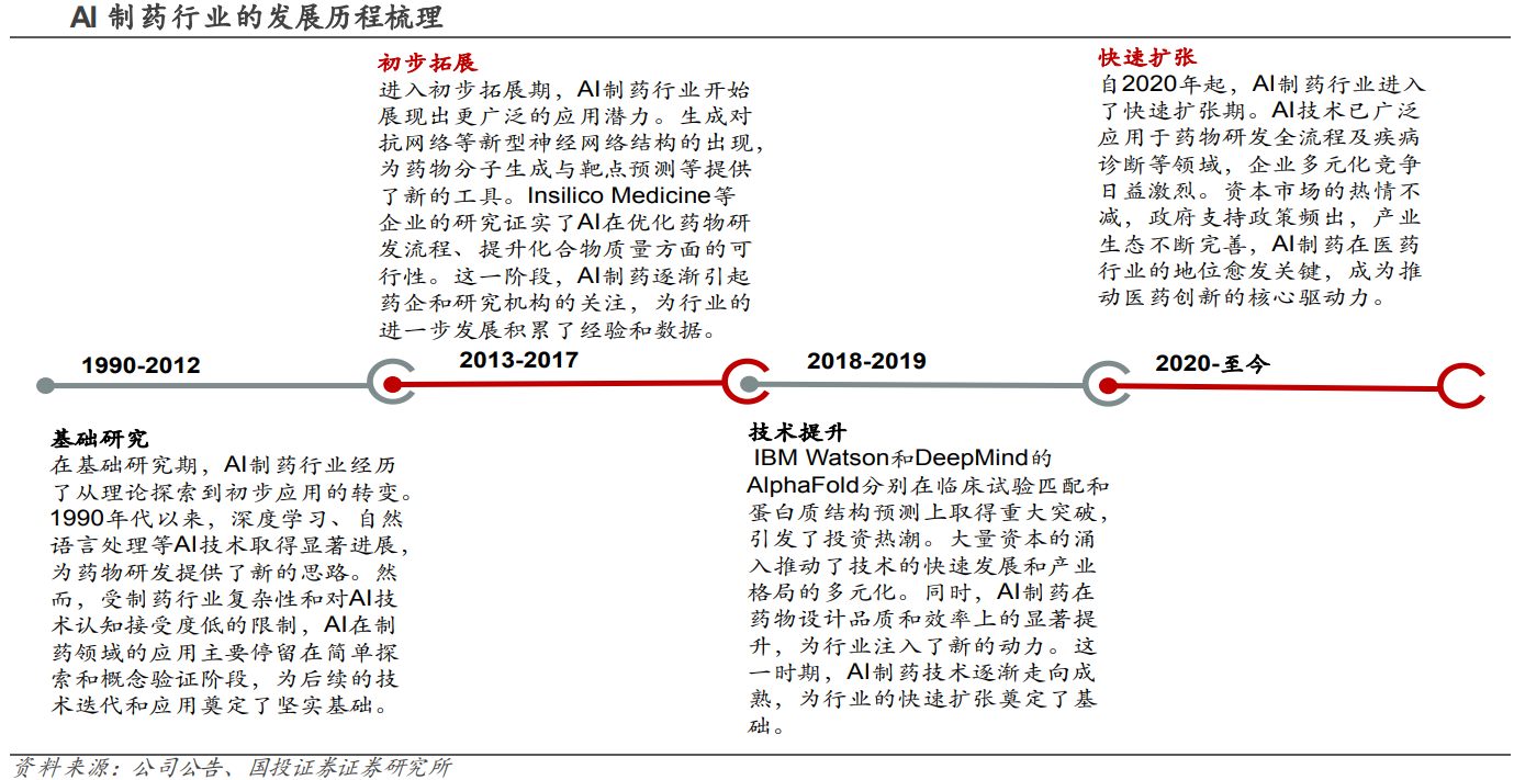 AI制药行业经历了基础研究期(1990年-2021年)、初步拓展期(2013年-2017年)、技术提升期(2018年-2019年)和快速扩张期(2020年-至今)。2020年后,AI制药行业进入突破期,AI药企开始追求端到端的服务能力,同时开始自建管线并推动临床试验完成。