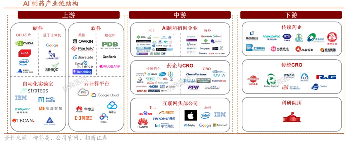 AI制药上游包括软硬件供应商,主要参与者是各类老牌互联网和电子企业,其中有效的规模化数据来源是上游关键竞争壁垒。产业链中游是AI制药主体,包括AI制药初创企业、传统药企/CRO公司以及互联网企业三大类。产业链下游是AI制药需求方,包括药企、CRO公司和科研机构等。
