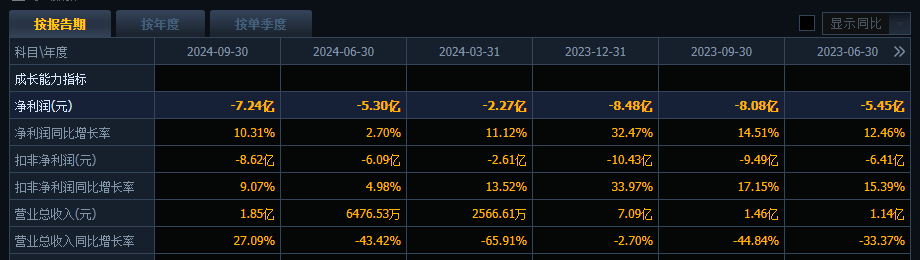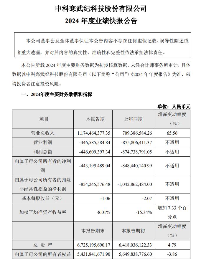 寒武纪27日晚间披露业绩快报,2024年,该公司实现营业收入11.74亿元,同比增长65.56%;归属于母公司所有者的净利润为亏损4.43亿元,上年同期亏损8.48亿元,也就是说,较上年同期的亏损收窄47.76%;基本每股收益为-1.06元,上年同期为-2.07元。