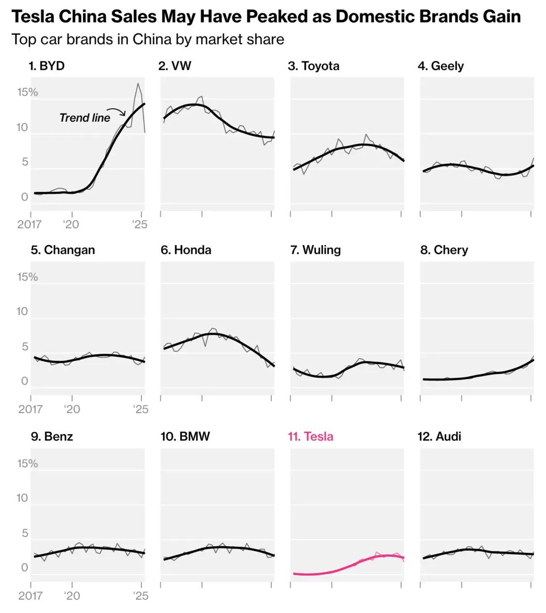 在中国前12大汽车制造商中(包括电动汽车、混合动力车以及其他类型汽车),特斯拉排在第十一位,市场份额远低于5%。实际上,大多数汽车制造商的市场份额趋势线都在下降,而非上升,尤其是那些国际汽车制造商。