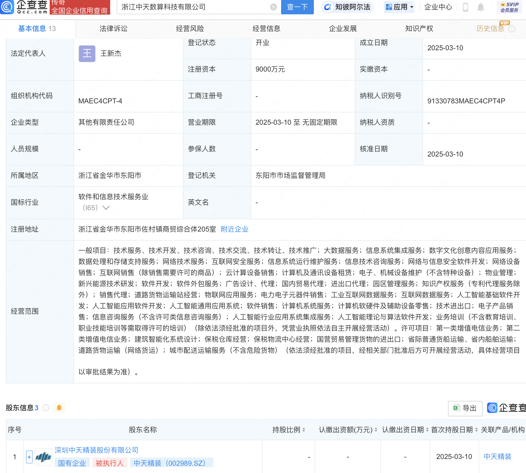 企查查APP显示,近日,浙江中天数算科技有限公司成立,法定代表人为王新杰,注册资本9000万元,经营范围包含:人工智能基础软件开发;人工智能应用软件开发;人工智能通用应用系统;人工智能行业应用系统集成服务等。企查查股权穿透显示,该公司由中天精装(002989)等共同持股。